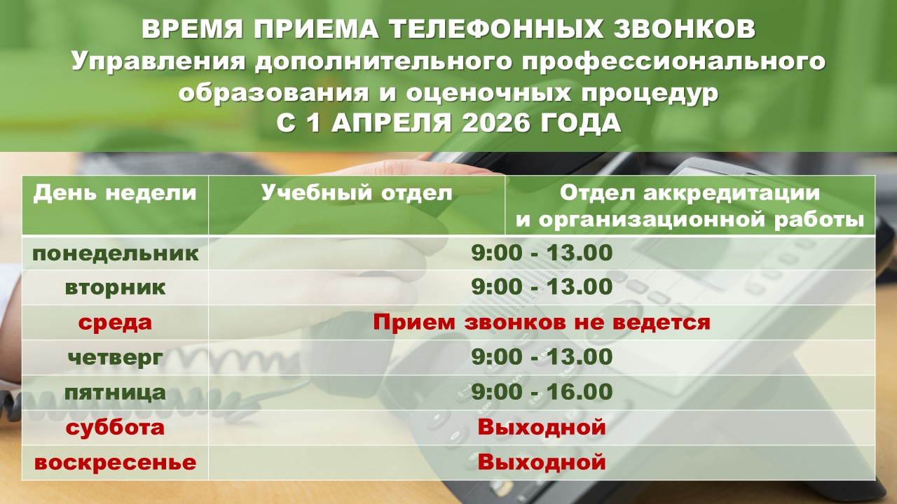 Информируем, что с 1 апреля 2026 года установлен график приема телефонных звонков Управления дополнительного профессионального образования и оценочных процедур:
